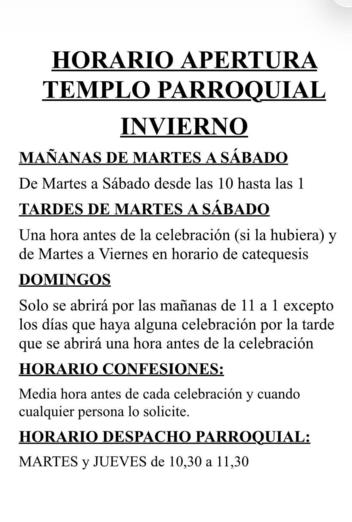- Una hora antes de la celebración (si la hubiera), y de Martes a Viernes en horario de catequesis.