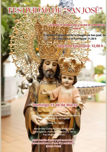 Tras finalizar la celebración el pasado  8 de marzo, los Solemnes 7 Domingos de San José; el próximo Domingo, 15 de marzo, se celebrará la SOLEMNIDAD DE SAN JOSÉ; por tal motivo, desde la Hermandad os queremos transmitir la invitación a los actos y Cultos que la Congregación Madres de Desamparados y San José de la Montaña de la localidad han preparado para dicho día: