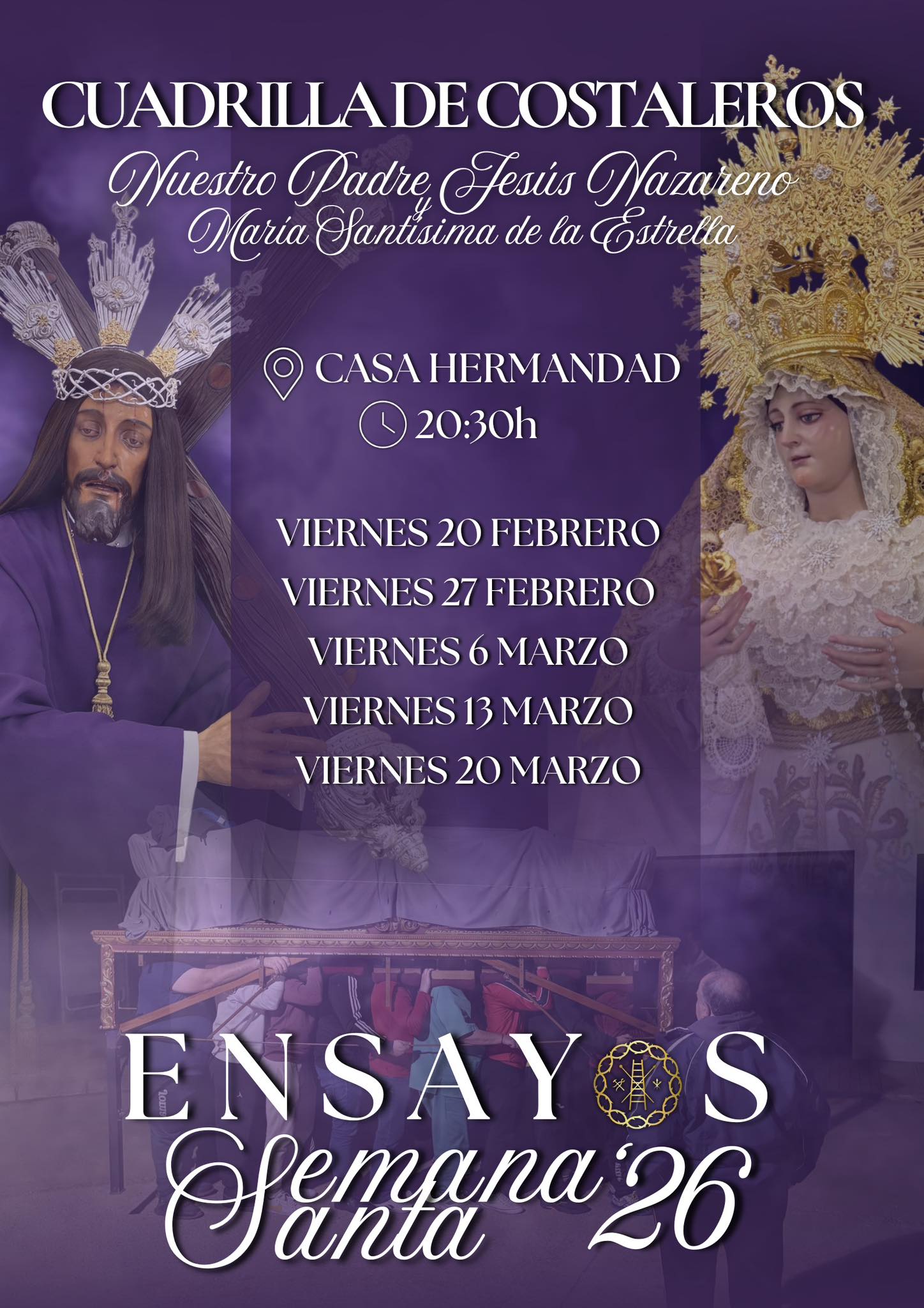 Hoy, primer Viernes de Cuaresma, como marca la tradición, comienzan los ensayos de las cuadrillas de costaleros de Nuestros Titulares.
