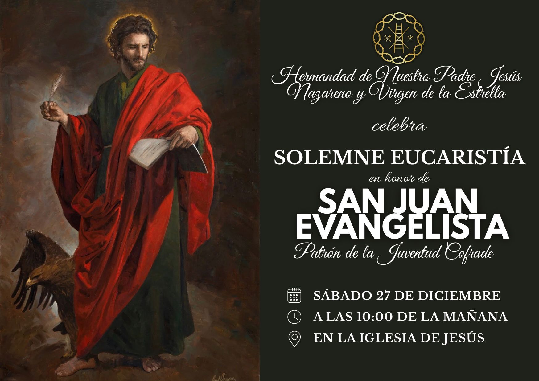 El próximo sábado, 27 de diciembre, a las 10:00 horas (diez de la mañana), en la Ermita de Jesús, la Hermandad celebrará la Misa a San Juan Evangelista, Patrón de la Juventud Cofrade.